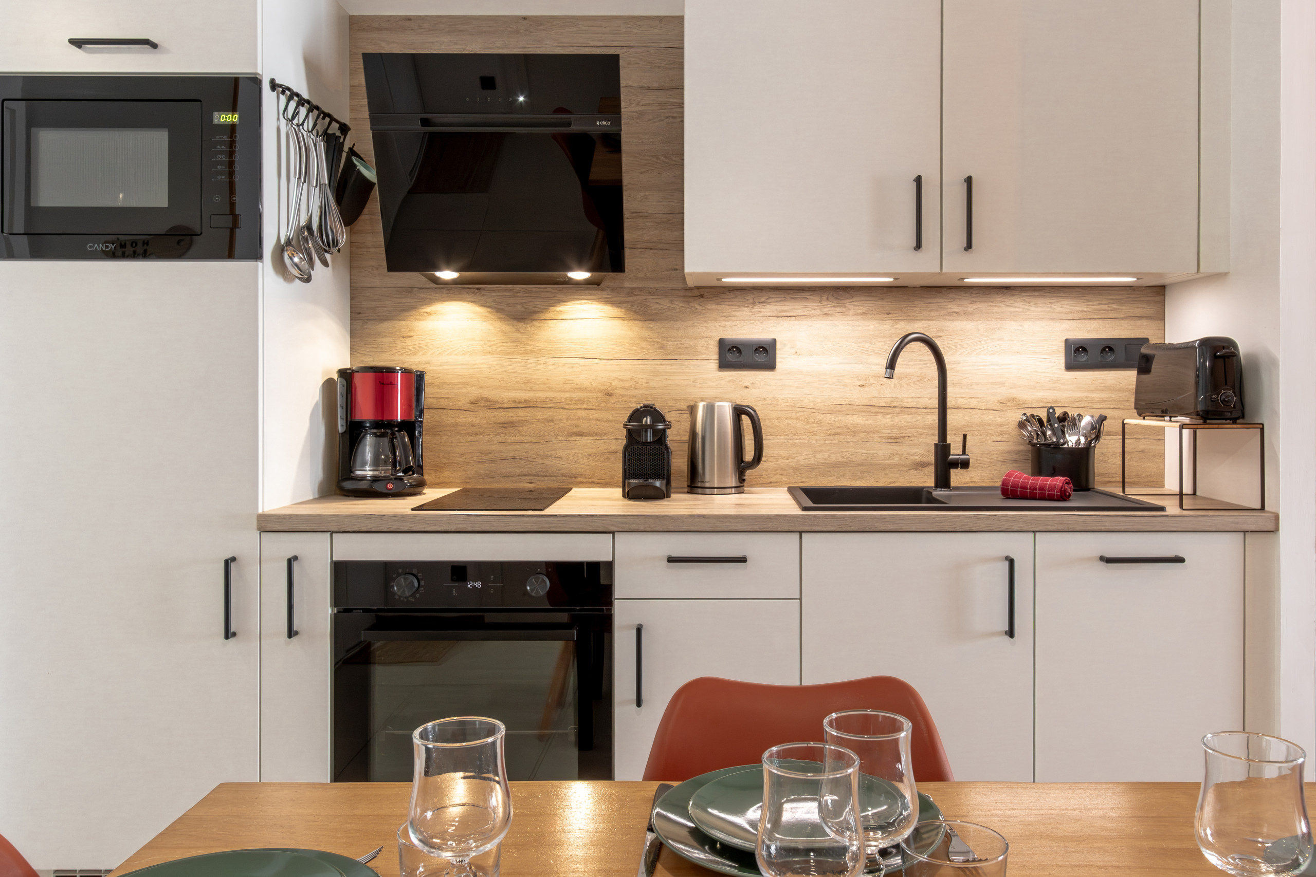 La cuisine est entièrement équipée avec tous les éléments essentiels pour préparer les repas.