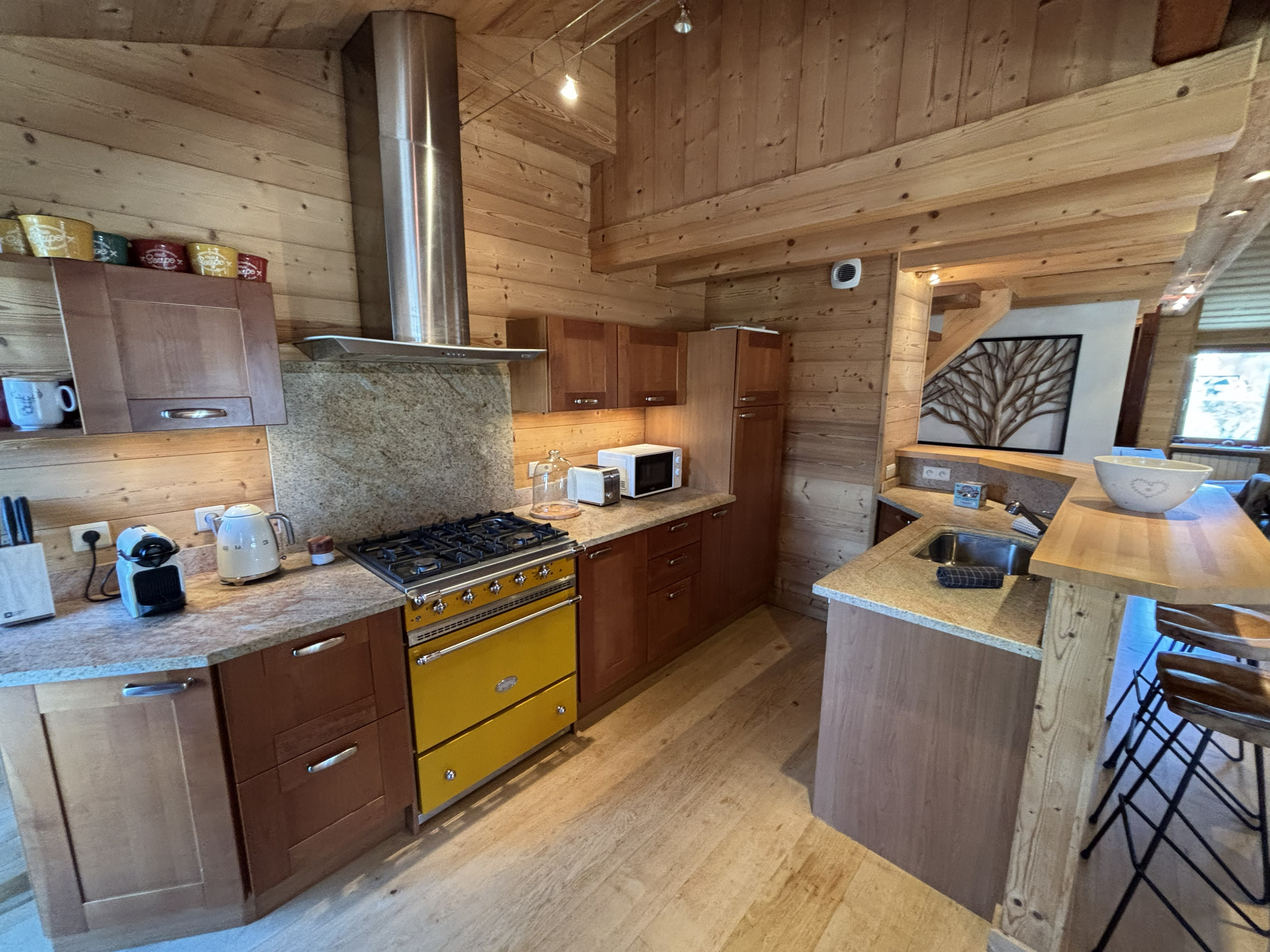 La cuisine est entièrement équipée avec tous les essentiels pour préparer des repas.