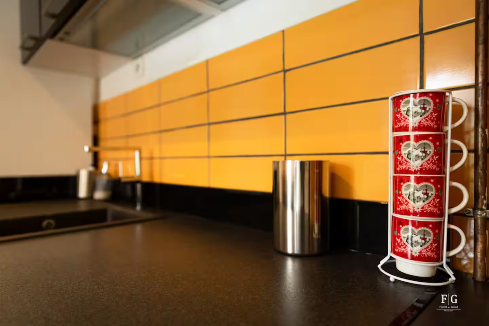 La cuisine est entièrement équipée avec tous les essentiels pour préparer des repas.